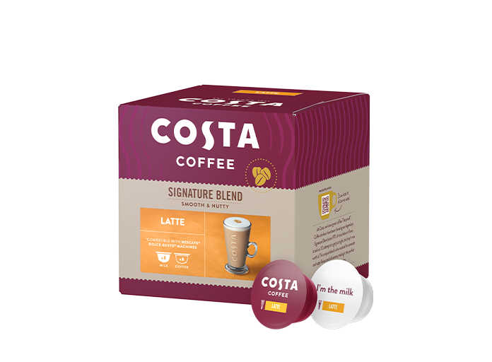 8 capsule premium Costa Coffee - Latte și 8 capsule premium de lapte - Latte, compatibile cu aparatele Nescafe® Dolce Gusto.