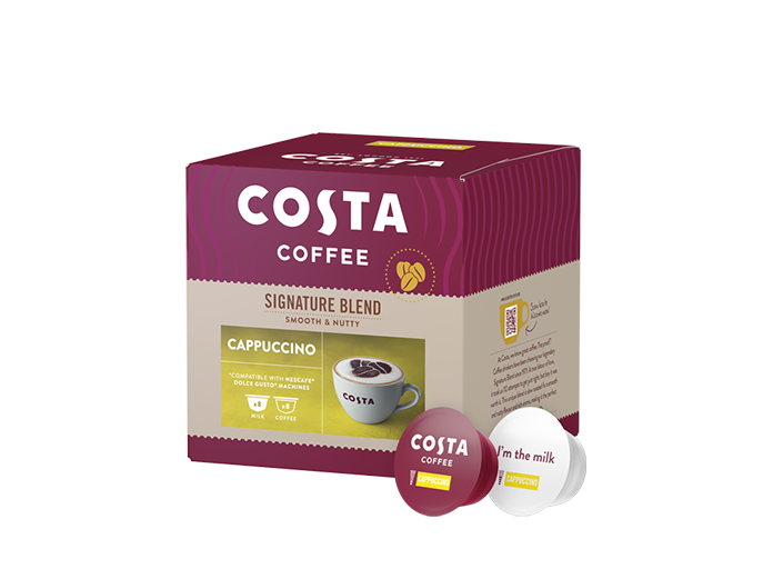 8 capsule premium Costa Coffee - Cappuccino și 8 capsule premium de lapte Cappuccino, compatibile cu aparatele Nescafe® Dolce Gusto®.
